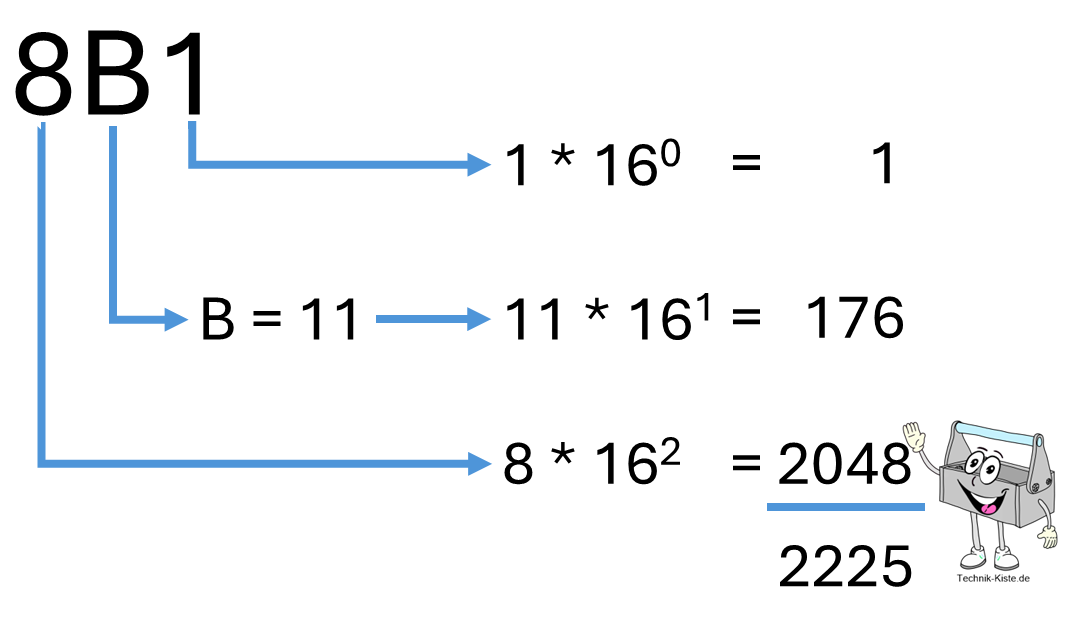 Umrechnung der hexadezimalen Zahl 8B1 in eine dezimale Zahl. Quelle: Technik-Kiste.de