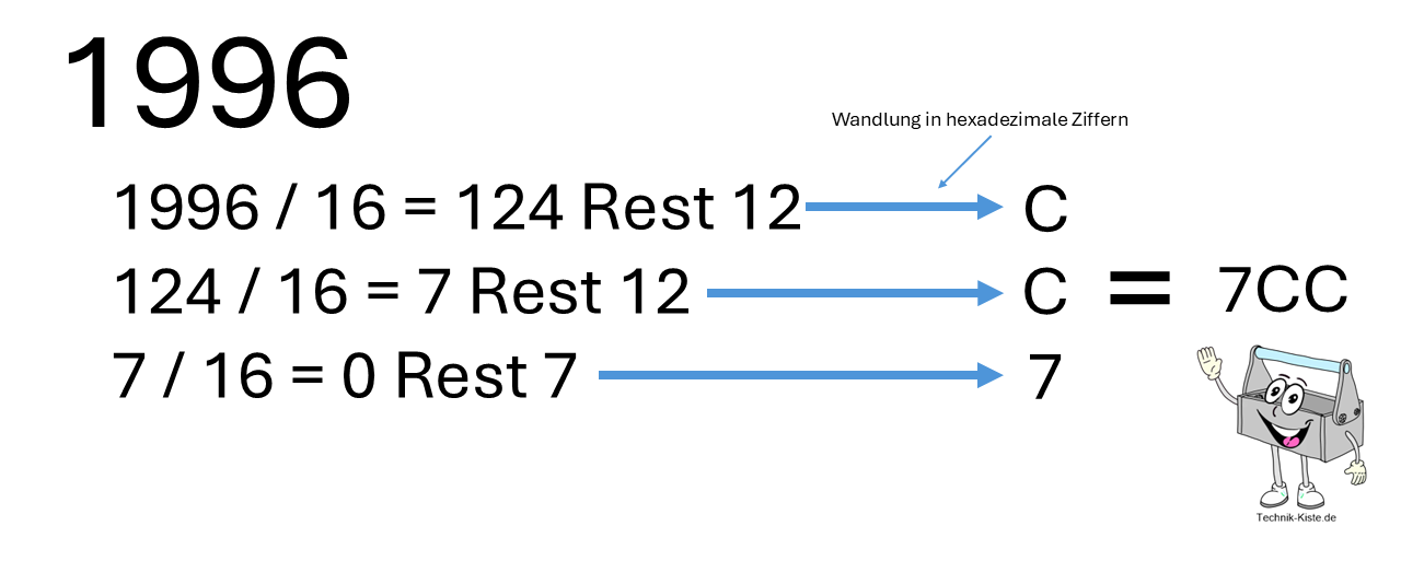 Umwandlung der Zahl 1996 in eine hexadezimale Zahl. Quelle: Technik-Kiste.de