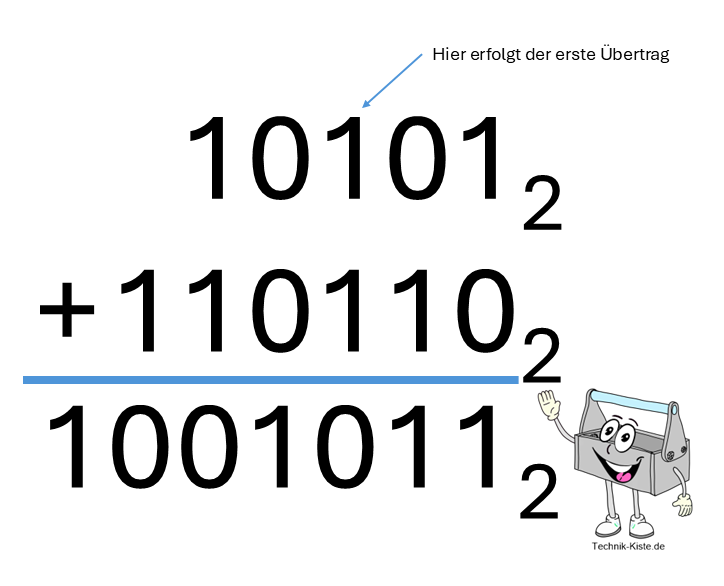 Schriftliche Addition im Binärsystem. Quelle: Technik-Kiste.de