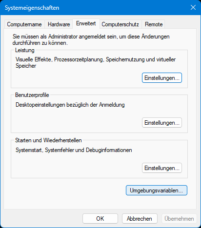 - Öffne die Systemeigenschaften → Erweiterte Systemeinstellungen → Umgebungsvariablen.