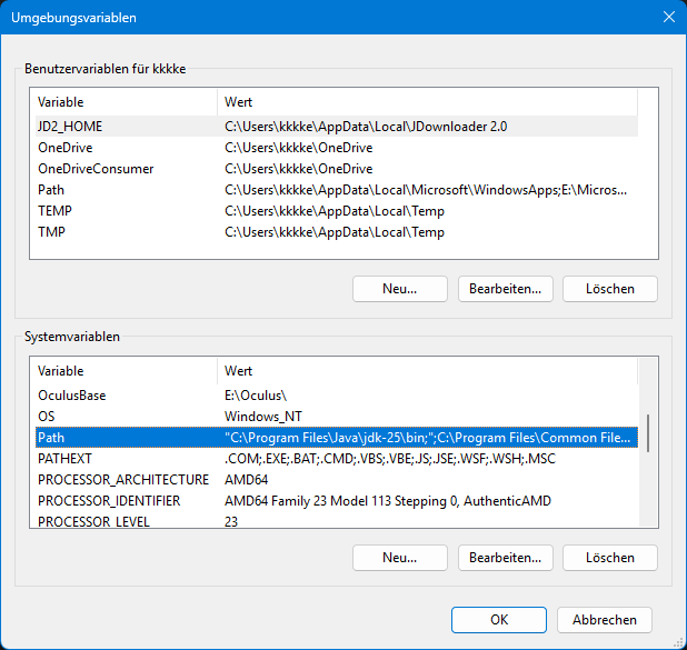 - Ergänze in PATH den Pfad zu bin im JDK‑Verzeichnis, z. B.: