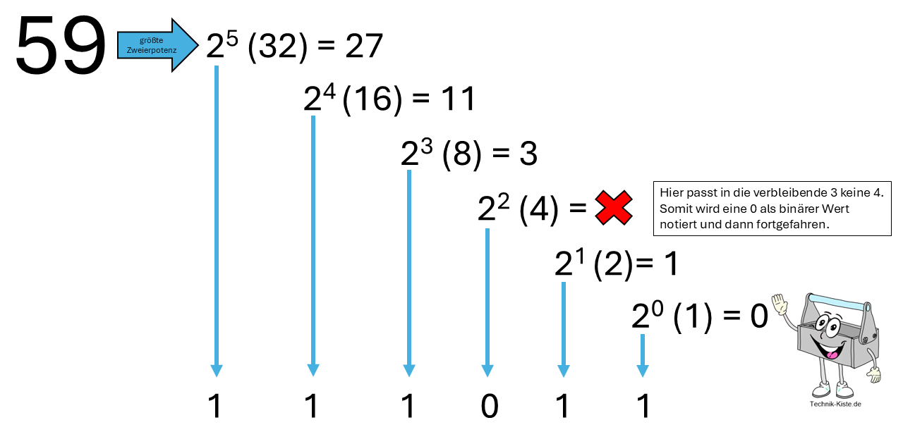 Umrechnung einer dezimalen Zahl 59 in eine binäre Zahl. Quelle: Technik-Kiste.de