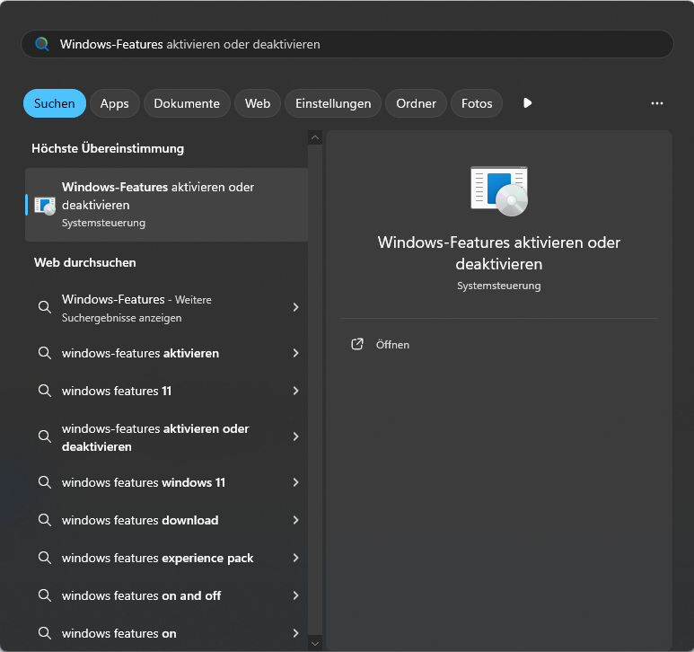 Windows-Features in der Windows Suche. Quelle: Screenshot Microsoft Windows 11
