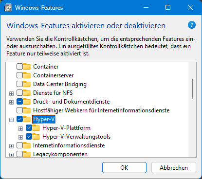 Sobald die Virtualisierung aktiviert ist, kannst du Hyper-V in Windows 11 aktivieren: