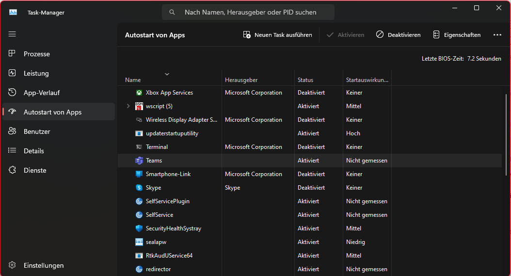 Reiter "Autostart von Apps" im Task-Manager. Quelle: Screenshot Microsoft Windows