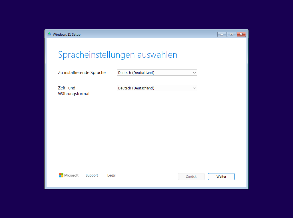 Auswahl der Spracheinstellungen. Quelle: Screenshot Microsoft Windows 11 Installation