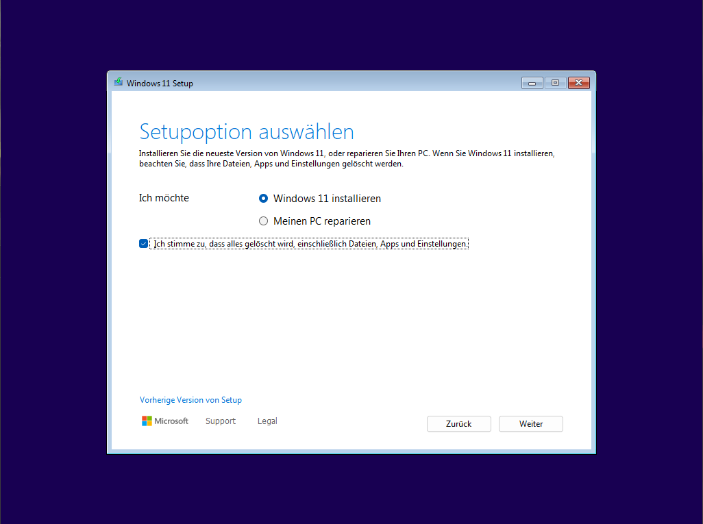 - Entscheide dich im folgenden Fenster für "Windows 11 installieren" und markiere das Feld "Ich stimme zu, dass alles gelöscht wird, einschließlich Dateien, Apps und Einstellungen" bevor du auf "Weiter" klickst.