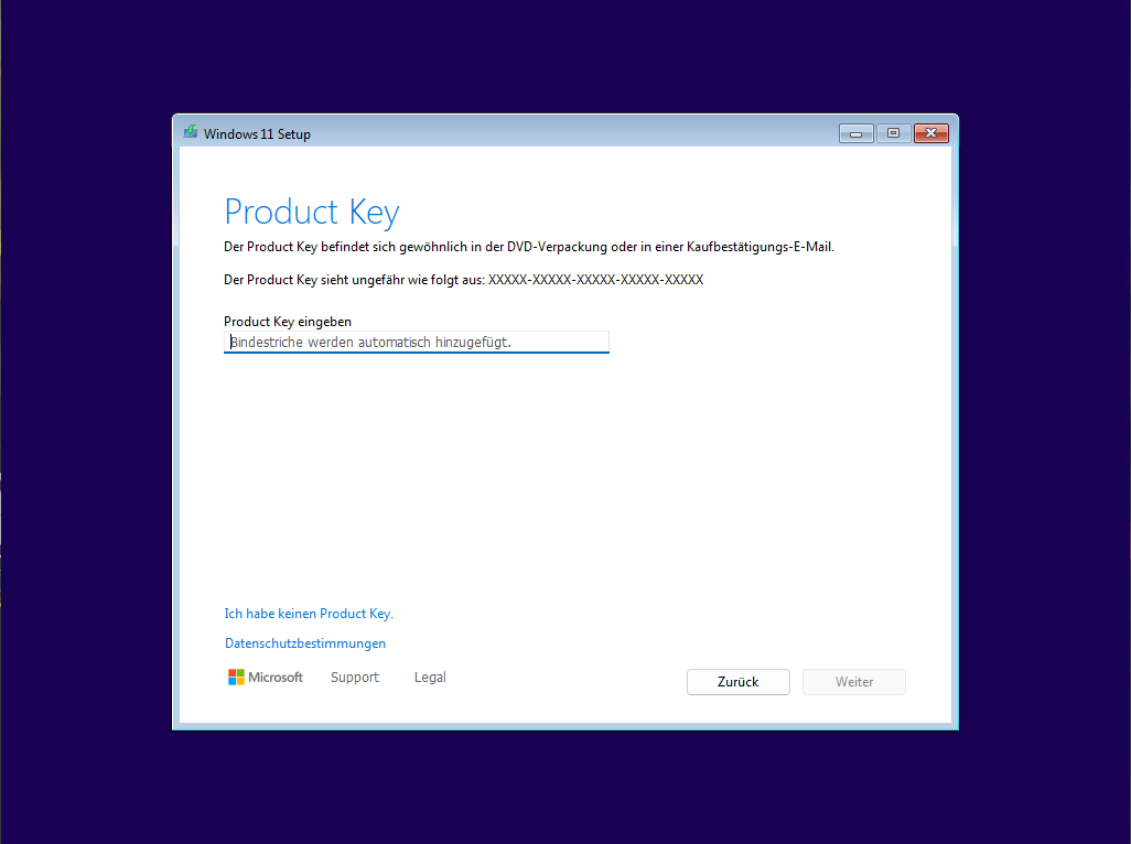 Eingabe eines Produktkeys. Quelle: Screenshot Microsoft Windows 11 Installation