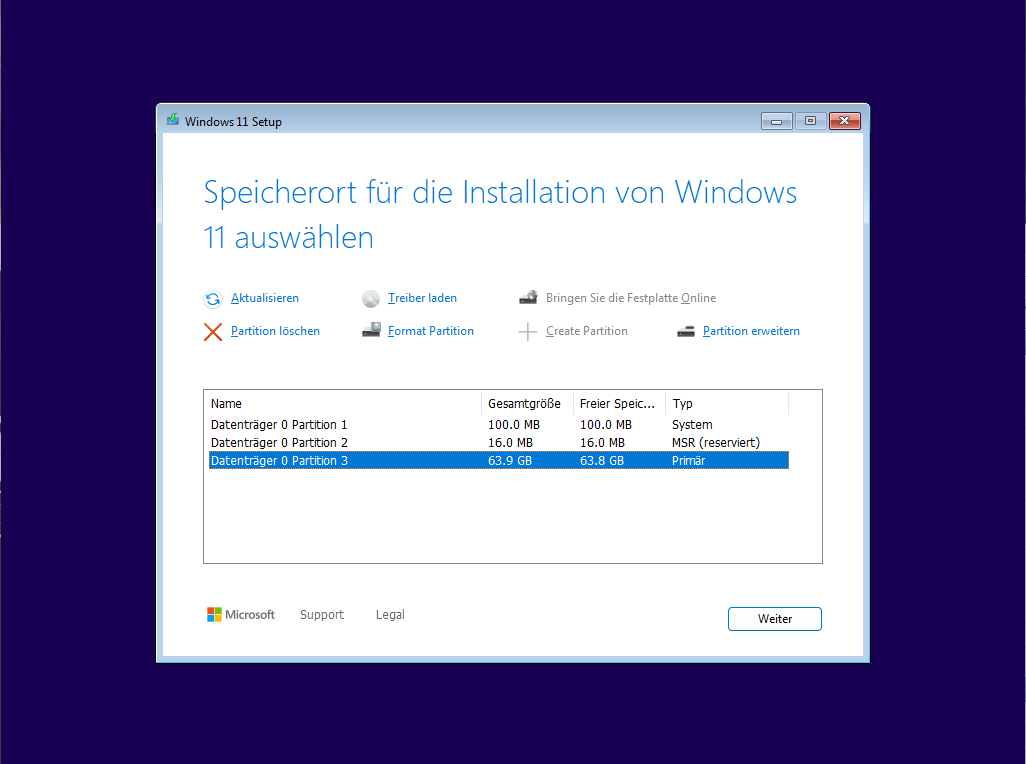 Hinweis: Wundere dich nicht, das Windows automatisch 3 Partitionen anlegt. Diese sind wichtig für die Funktion des Systems. Für die Installation musst du die Größte der 3 Partitionen anwählen und mit "Weiter" bestätigen.