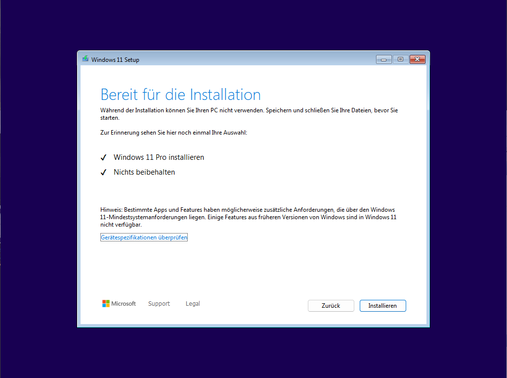 Bereit für die Installation. Quelle: Screenshot Microsoft Windows 11 Installation