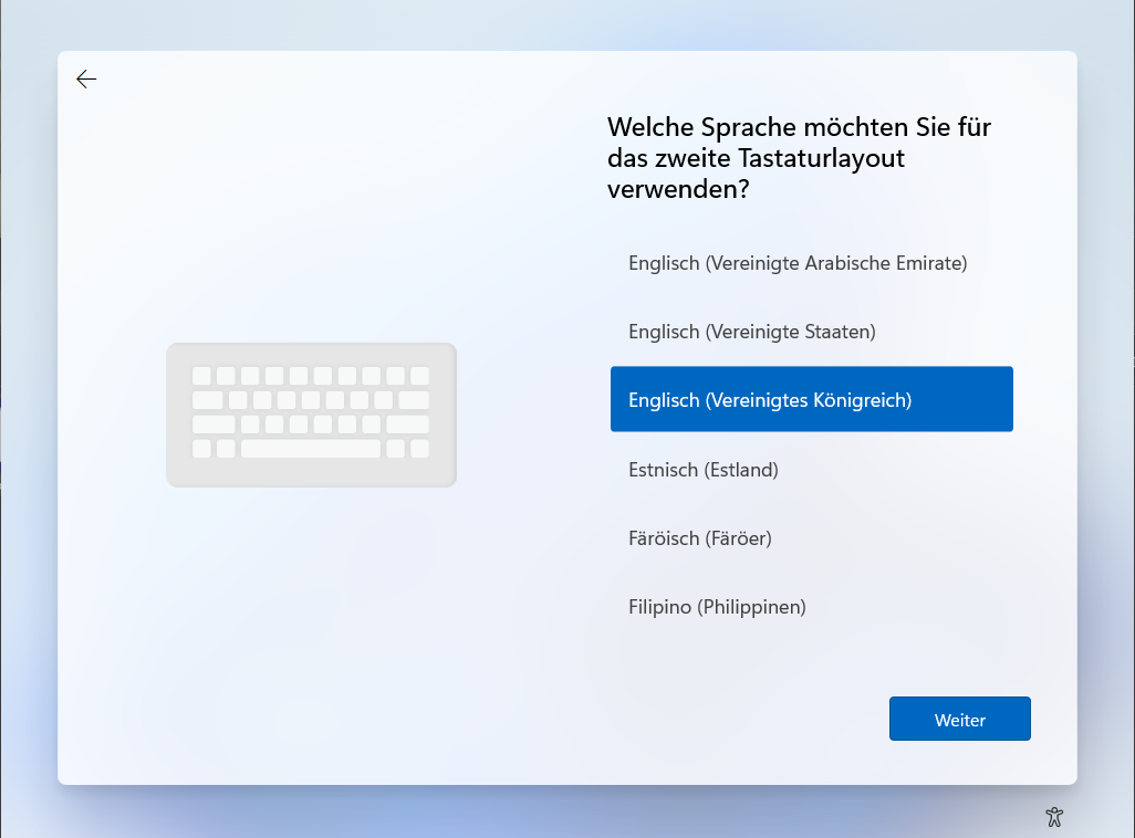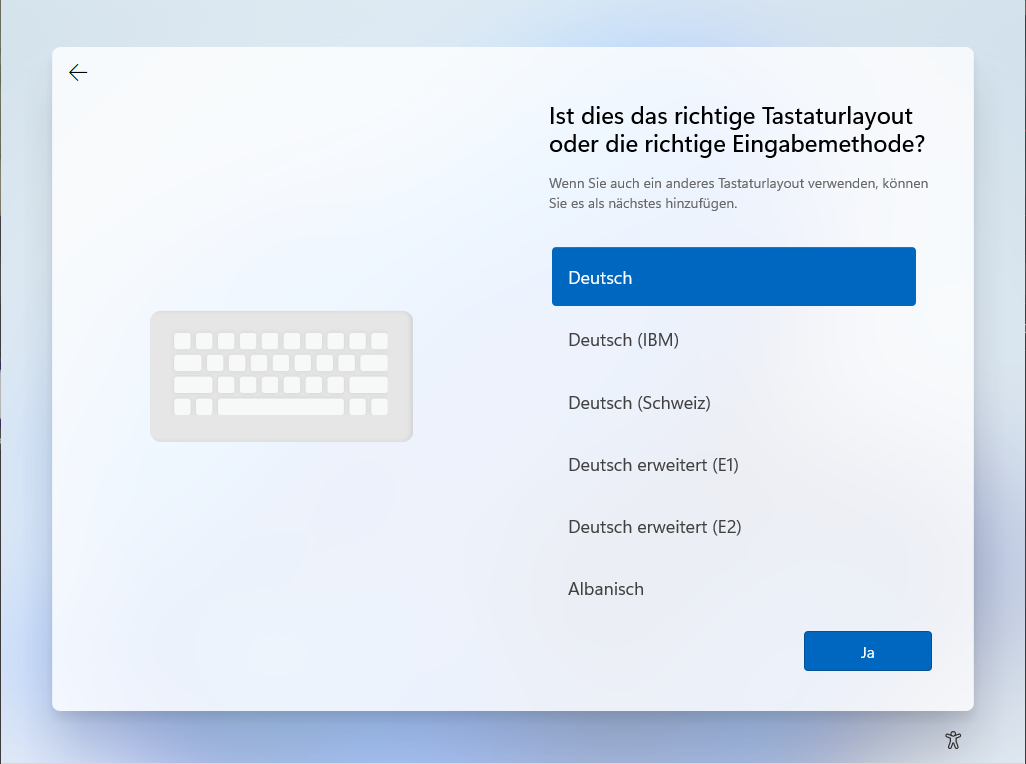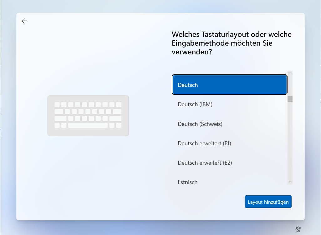 Auswahl Tastaturlayout. Quelle: Screenshot Microsoft Windows 11 Installation