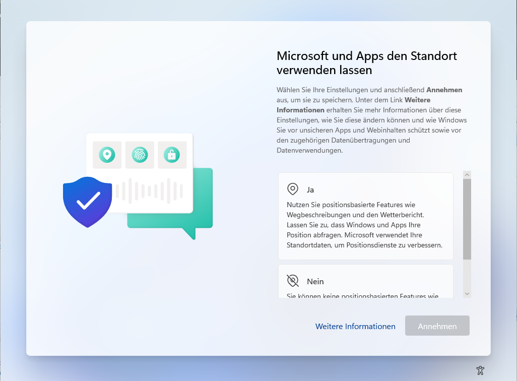 Auswahl der Standortdienste. Quelle: Screenshot Microsoft Windows 11 Installation