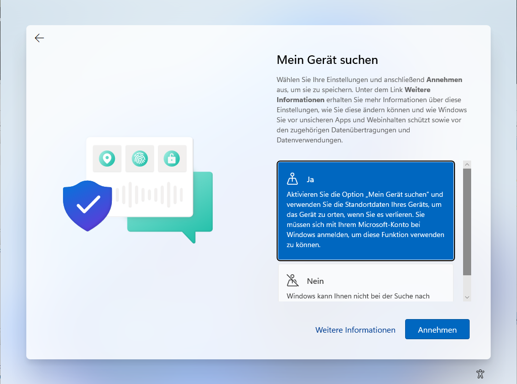 Auswahl ob das Gerät gefunden werden kann. Quelle: Screenshot Microsoft Windows 11 Installation