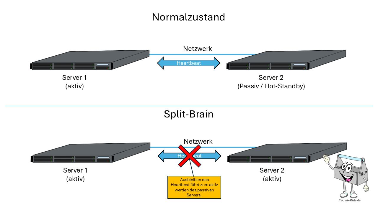 In der Informatik bezeichnet Split‑Brain einen Fehlerzustand in einem Cluster (z. B. Hochverfügbarkeits‑ oder Storage‑Cluster), bei dem zwei oder mehr Knoten die Verbindung zueinander verlieren, aber weiterhin unabhängig arbeiten – und dabei gleichzeitig die aktive Rolle übernehmen.