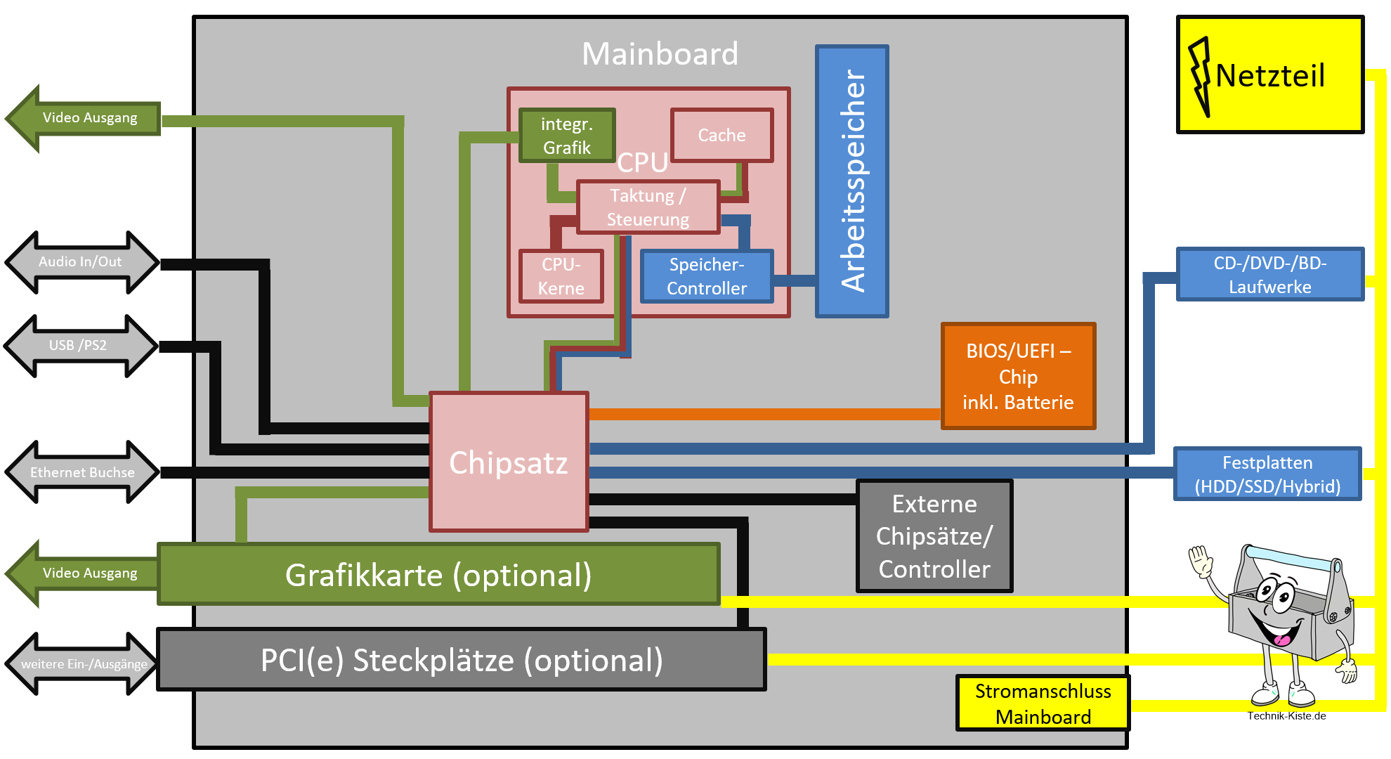 Zwar teilen sich alle Computerbauformen das Prinzip, wie sie funktionieren, doch unterscheiden sie sich in ihrem Aufbau sehr stark. In diesem Beitrag erfährst du, wie ein PC - also Personal Computer - meist aufgebaut ist.