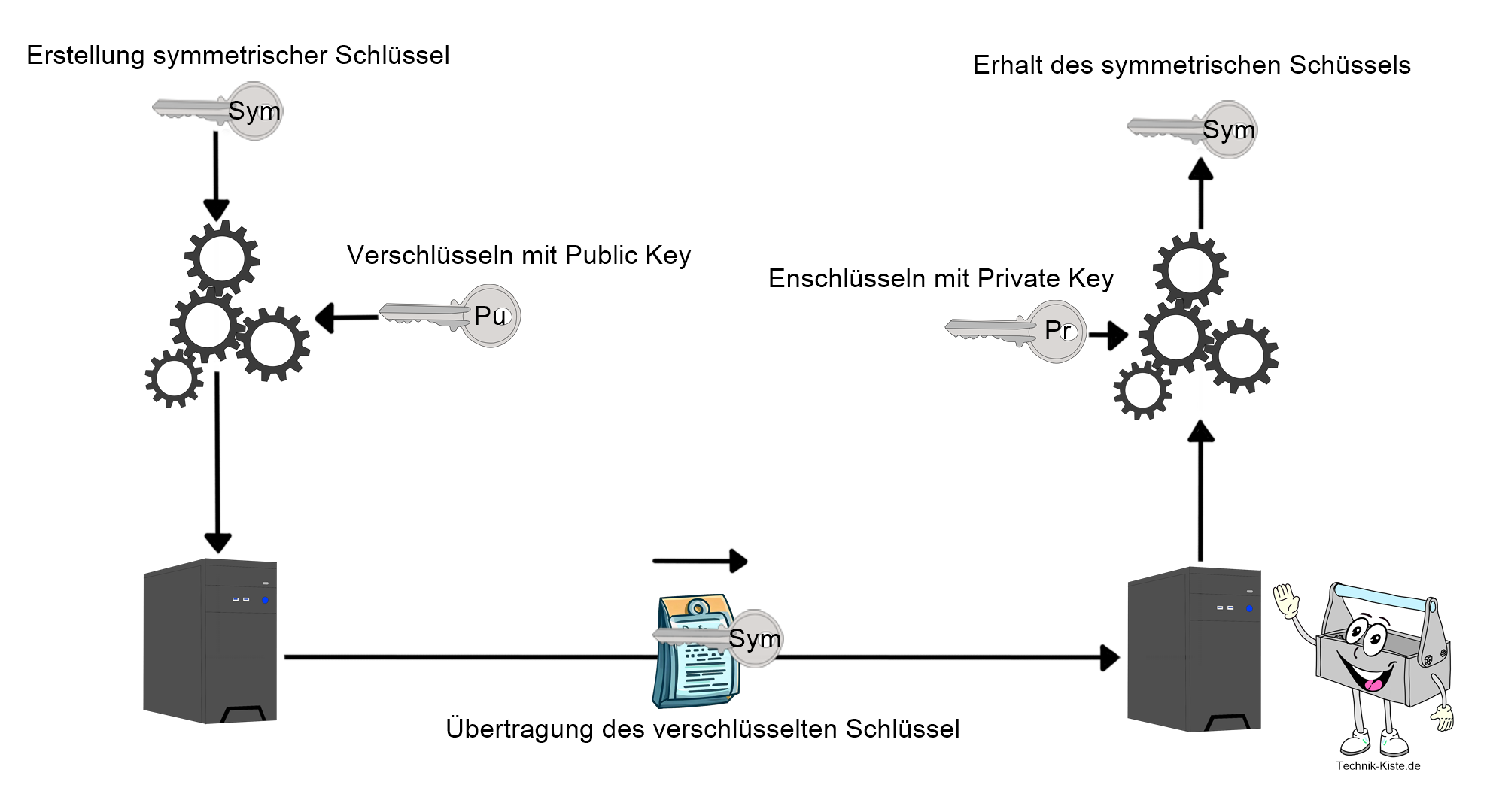 Da bei symmetrischen Verschlüsselungen die größte Gefahr bei der Übermittlung bzw. Verteilung des Schlüssels besteht, kann auf ein asymmetrisches Verschlüsselungsverfahren zurückgegriffen werden.  So können regelmäßig neue Sitzungsschlüssel erzeugt und verschlüsselt durch eine asymmetrische Verschlüsselung übertragen werden.