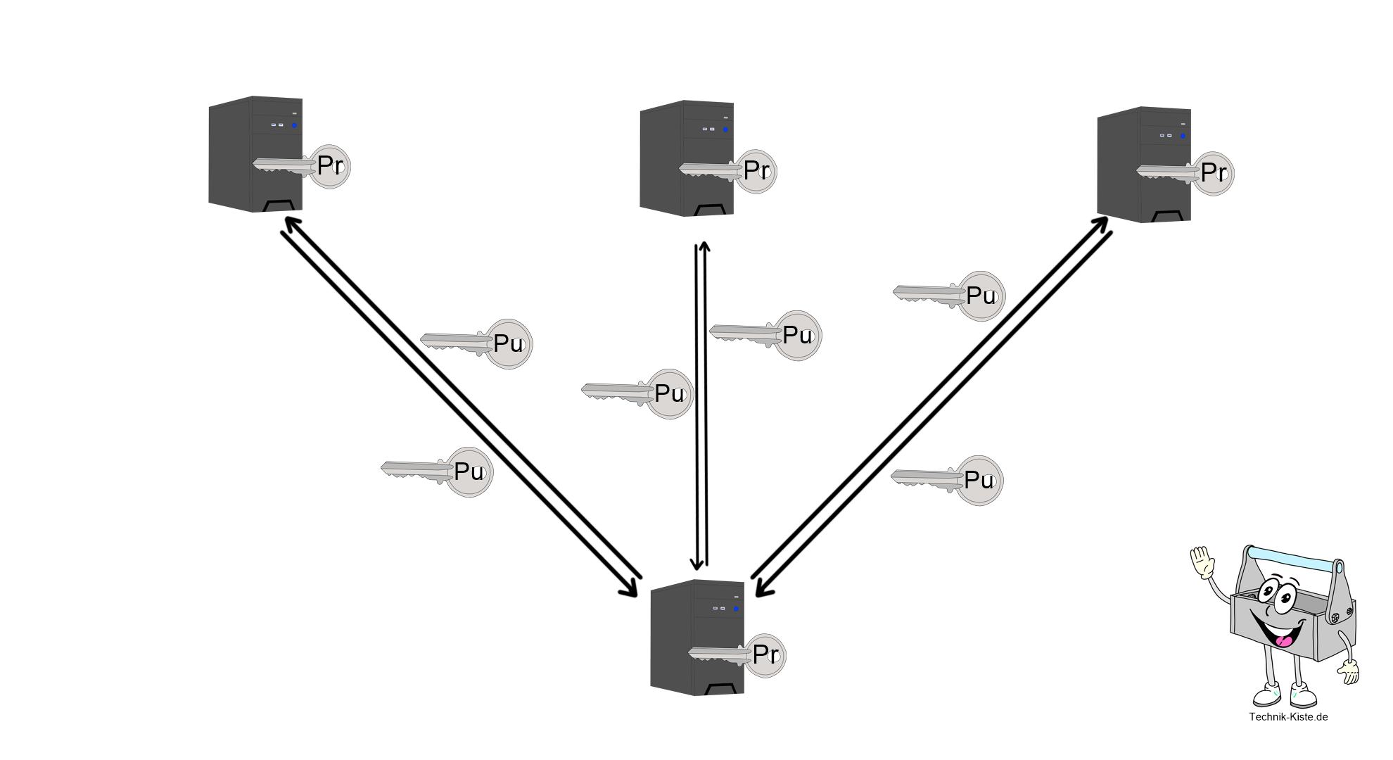 Daraus ergeben sich für die Kommunikation zwischen zwei Kommunikationspartnern immer zwei Schlüsselpaare. Dabei bleibt der Private Key immer im Besitz des Urhebers und wird nicht versendet!