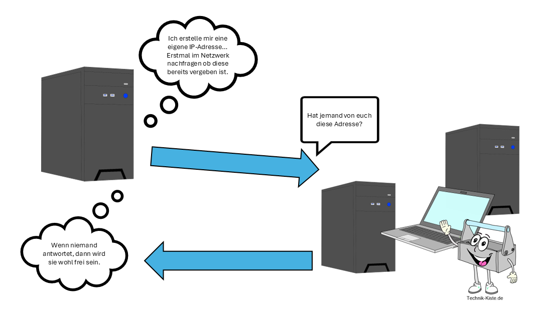 Vereinfachtes Prinzip von Zeroconf in einem kleinen Netzwerk. Quelle: Technik-Kiste.de