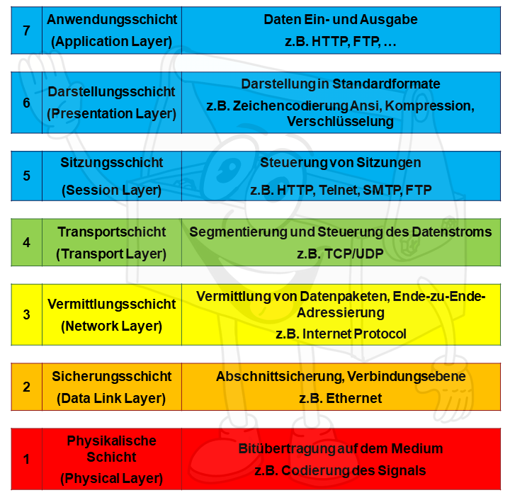Das OSI-Modell gliedert sich in 7 Schichten. Diese Schichten sind z.B. für die Datenstandardisierung, Adressierung und Kodierung zuständig. Das Modell besteht aus folgenden Schichten: