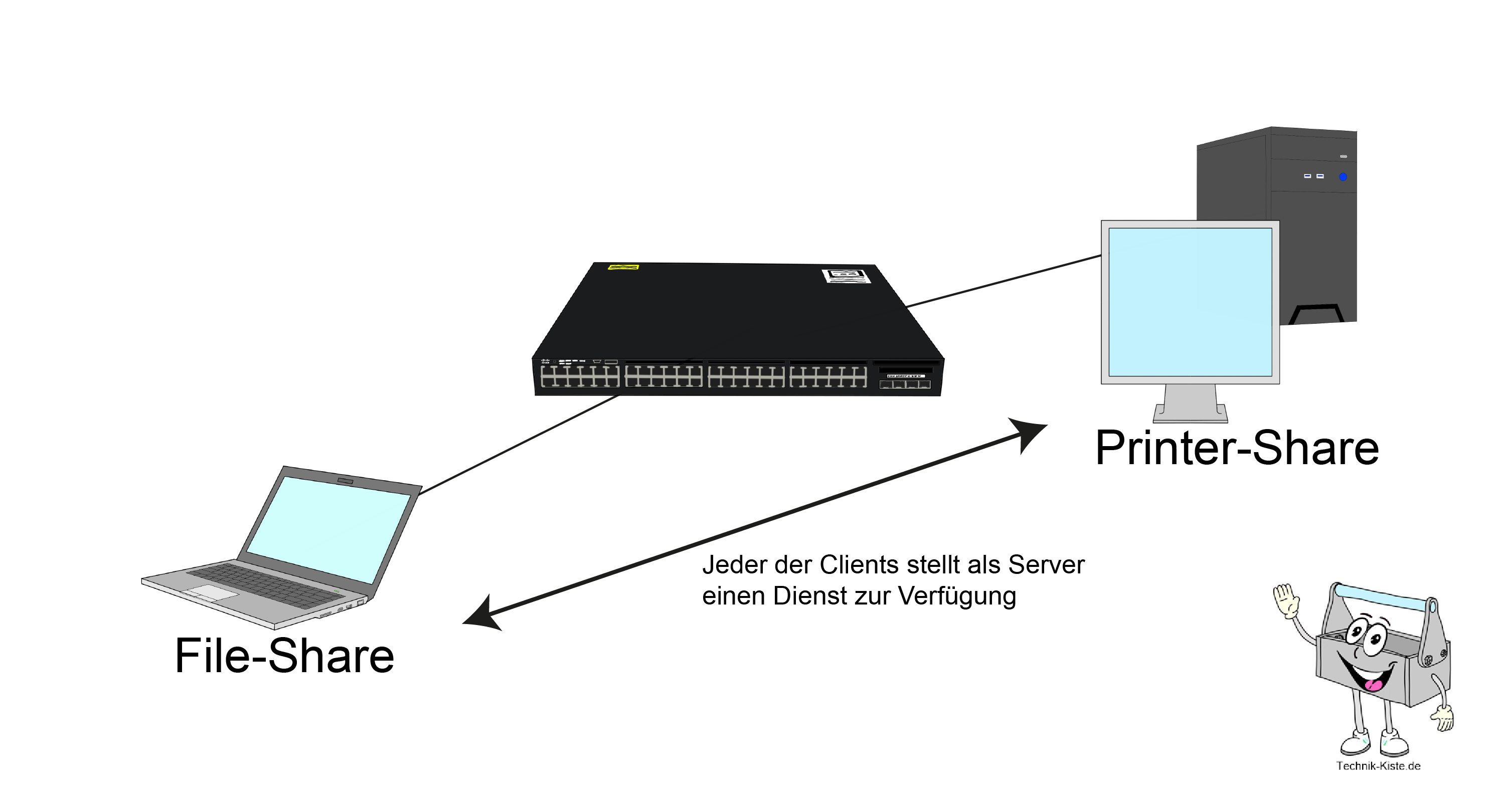 In diesem Modell können Hosts zugleich Client als auch Server sein. Sie "sharen" - also sie teilen Ressourcen - wie z. B. Drucker oder Dateien im Netzwerk und sind dabei für andere Clients als Server zu erkennen, da sie einen Dienst im Netzwerk bereitstellen.