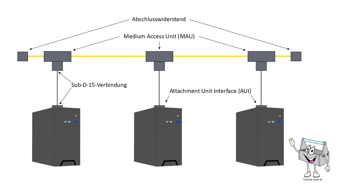 Um einen Netzwerkteilnehmer an das Koaxialkabel anzubinden, wurden Medium Access Units (MAU) benötigt, um einen mechanischen Kontakt (den „Stachel“ bzw. Vampire Tab) in das Kabel bis zum Innenleiter einzuführen. Über einen Sub-D-15 Stecker wurde das Attachment Unit Interface (AUI) des Endgerätes dann an die MAU angeschlossen.