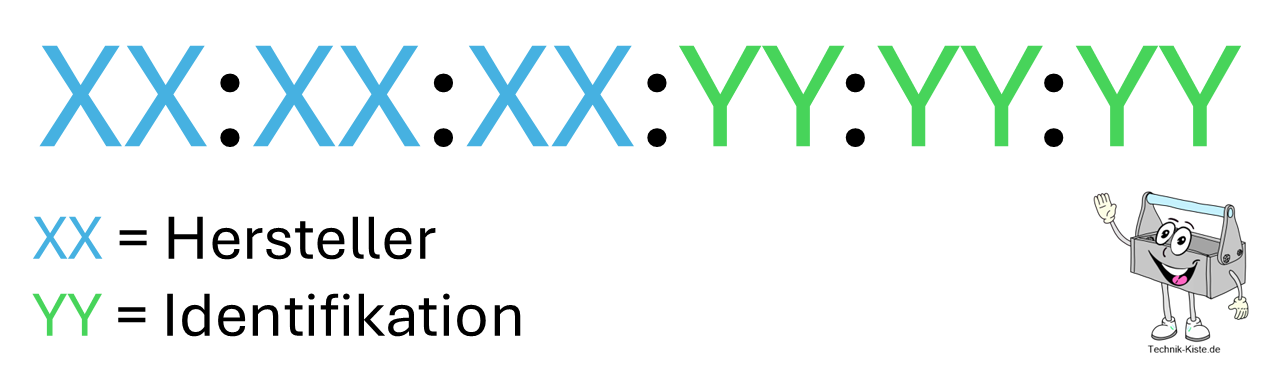 Aufbau einer MAC-Adresse in ihrer kanonischen Schreibweise. Quelle: Technik-Kiste.de