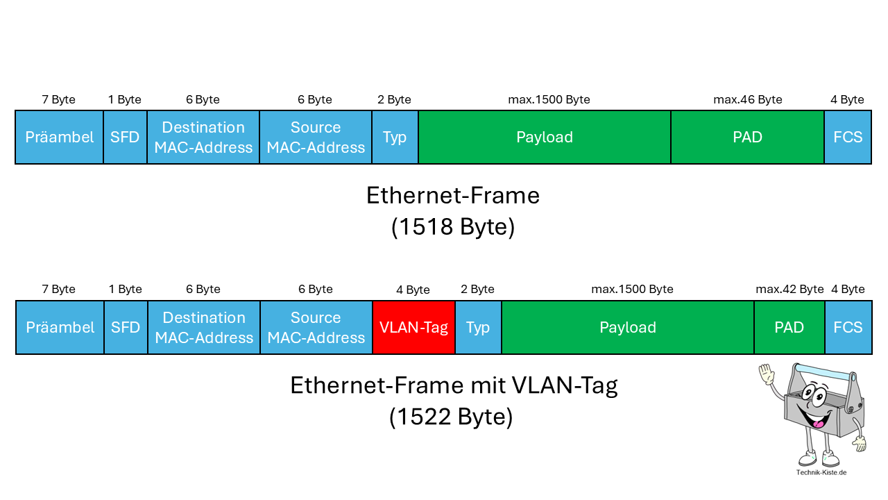 Bei der Übertragung folgt der Ethernet-Frame einem festen Aufbau der abhängig davon ist, ob im Netzwerk VLAN-Tags verwendet werden. Vom Aufbau des Frames ist die Länge des Frames abhängig.