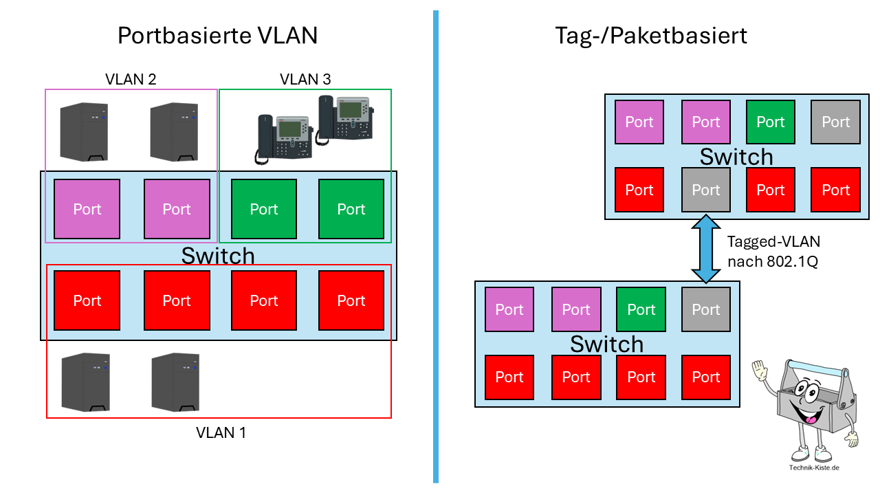 Auch wenn in vielen Einführungen oft nur zwei Arten genannt werden, gibt es mehr als eine Möglichkeit, VLANs zu unterscheiden. In der vereinfachten Praxisdarstellung unterscheidet man meist: