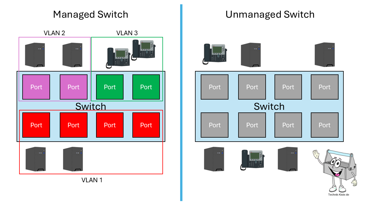 - Managed Switch: Ermöglicht das Erstellen und Konfigurieren mehrerer VLANs.