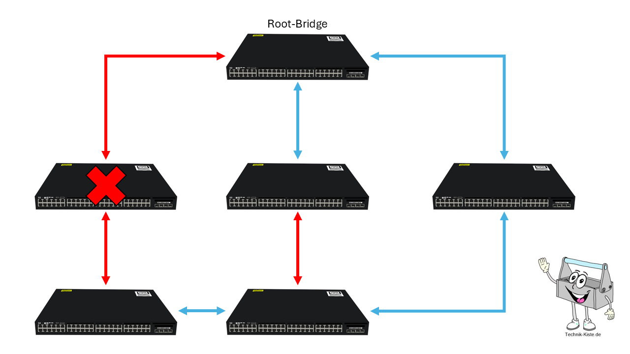 In unserem vorherigen Beispiel fällt einer der Switches im Netzwerk aus. Somit einigen sich die verbliebenen Switches auf eine neue Topologie: