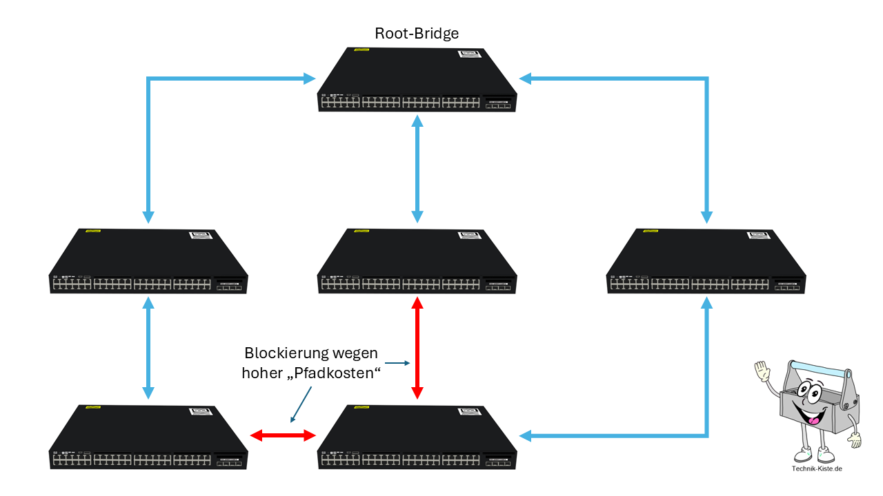 Alle anderen Switches ermitteln den kostengünstigsten Pfad (geringste Summe der Portkosten) zur Root Bridge. - Pfadblockierung für Schleifenfreiheit